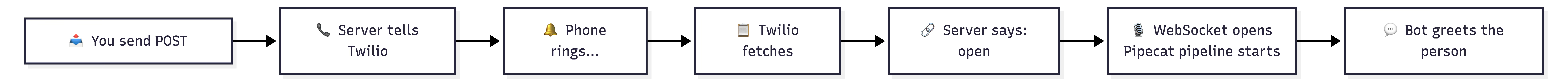 This is the same WebSocket endpoint from the inbound bot. Once it’s open, audio flows in both directions through Twilio Media Streams and the Pipecat pipeline does its thing - listen, think, respond.